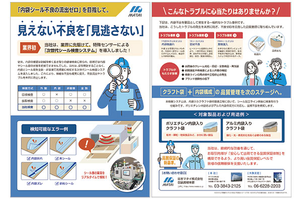 日本マタイ株式会社(本社:東京都、代表取締役社長:中西 孝夫)は、兵庫工場の内袋入りクラフト袋製造工程において、袋を開封することなく内袋およびシール部の状態を検知できる「次世代シール検査システム」を導入しました。